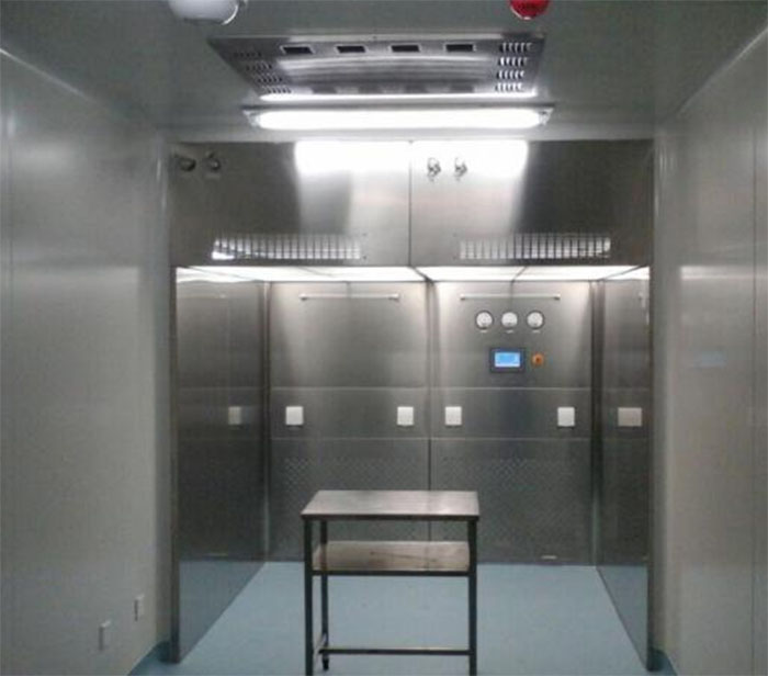 大型負壓稱量間|稱量棚|稱量亭采用垂直單向流的氣流形式,回風(fēng)先要通過初效過濾器進行預(yù)過濾,將氣流中的大顆粒粉塵粒子處理掉,經(jīng)過預(yù)處理后的空氣,再經(jīng)過中效過濾器進行二次過濾,以起到充分保護高效過濾器的作用。稱量亭在離心風(fēng)機提供的壓力下,通過高效過濾器,使之達到潔凈要求。